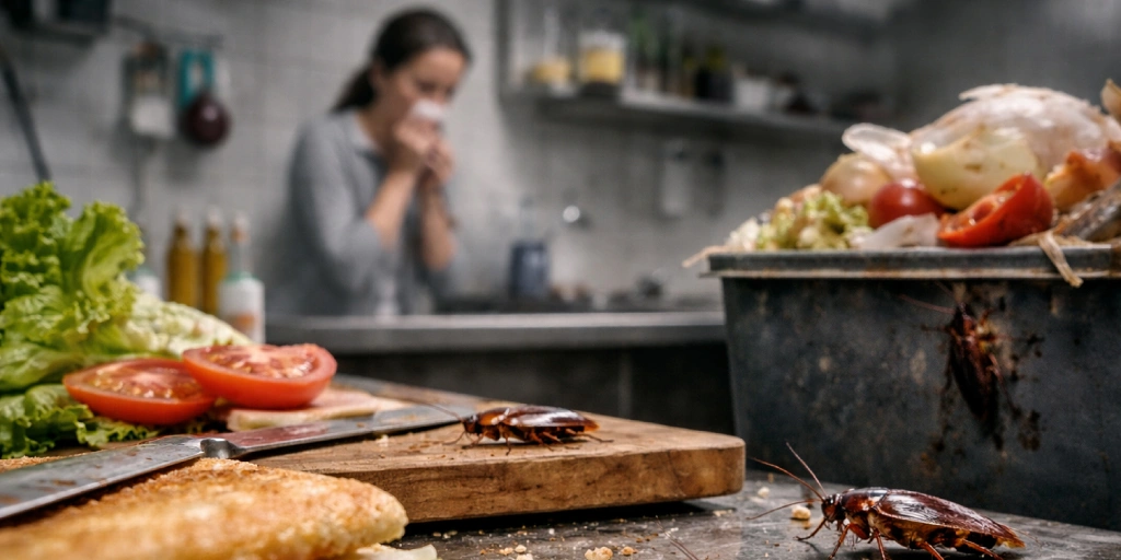 - Contaminación indirecta: las cucarachas pueden transportar microorganismos desde zonas contaminadas (desagües, basuras, grietas) hacia superficies de contacto y alimentos, elevando el riesgo de enfermedades gastrointestinales.
