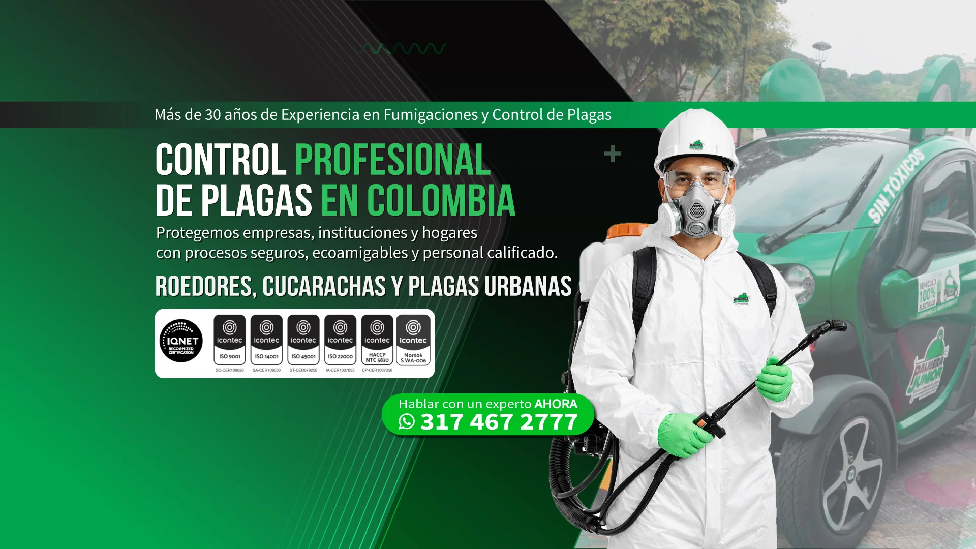 En Palmera Junior SAS somos líderes en el control de plagas en Popayán, ofreciendo soluciones profesionales, seguras y certificadas para hogares, empresas, restaurantes, hoteles e industrias. Con más de 28 años de experiencia, trabajamos bajo las normas más estrictas de calidad y seguridad, asegurando ambientes libres de plagas que afectan la salud y la reputación de tu negocio.
