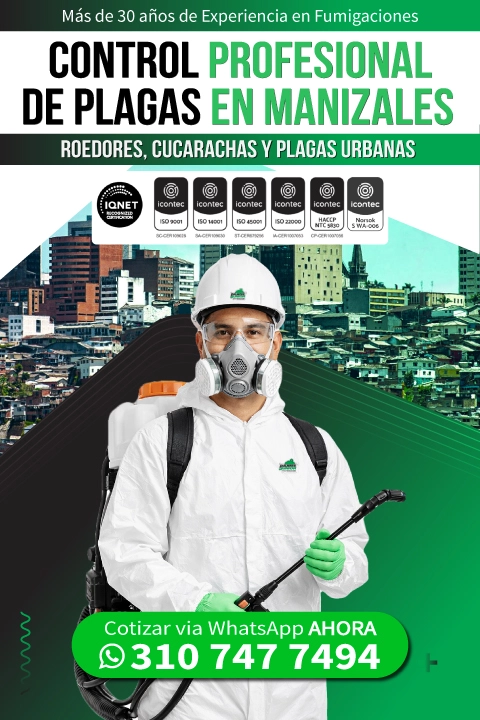 En Manizales, ofrecemos una amplia gama de servicios de control de plagas, desde desratización hasta fumigación de cucarachas y control de mosquitos. ¡Confía en nosotros para mantener tu espacio libre de plagas!