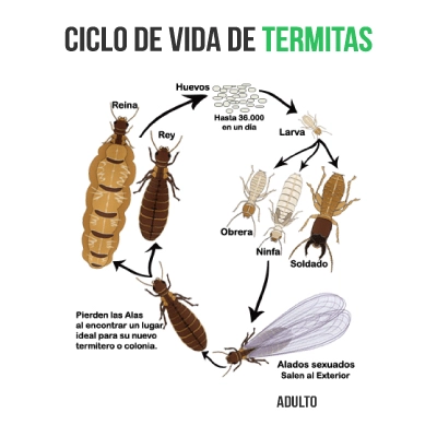 - Adulto: Incluye a las obreras, soldados y reproductores (alados o enjambradores).